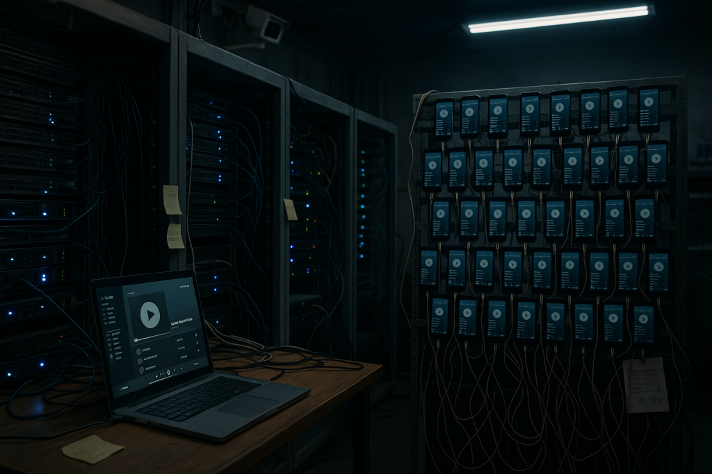 Inside a bot farm—networks of automated accounts driving fake Spotify streams and ad fraud, a key factor in the Spotify bot crisis. Image created using Gemini